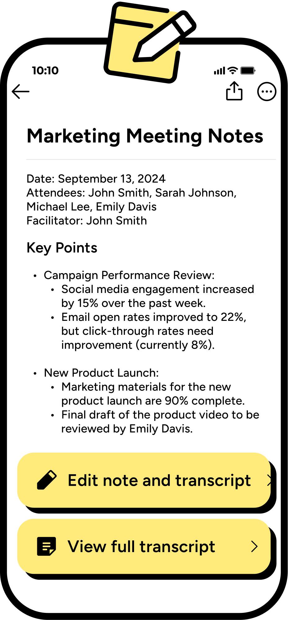 Never miss an action item. Use our AI meeting note taker to organize discussions, decisions, and to-do lists automatically.